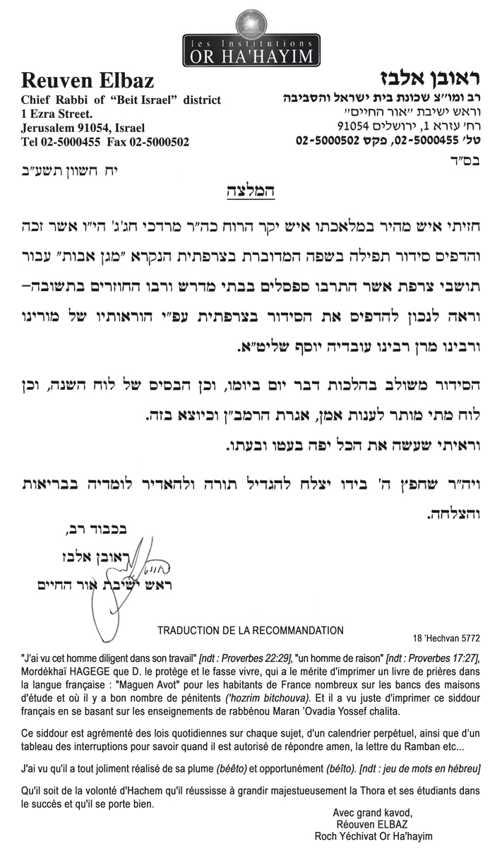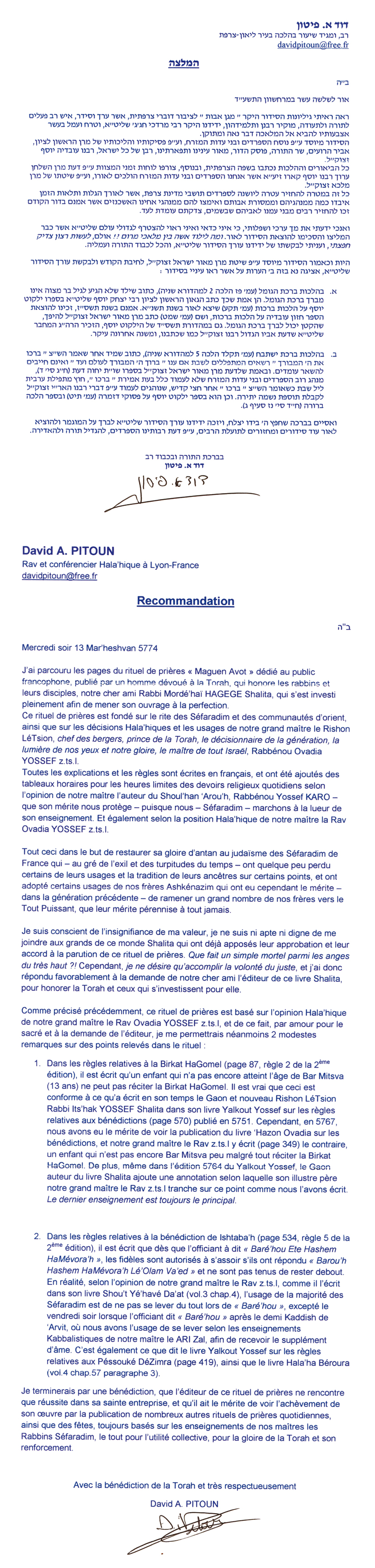 Approbation du Rav David PITOUN chalita, traducteur Rabbin Villeurbanne