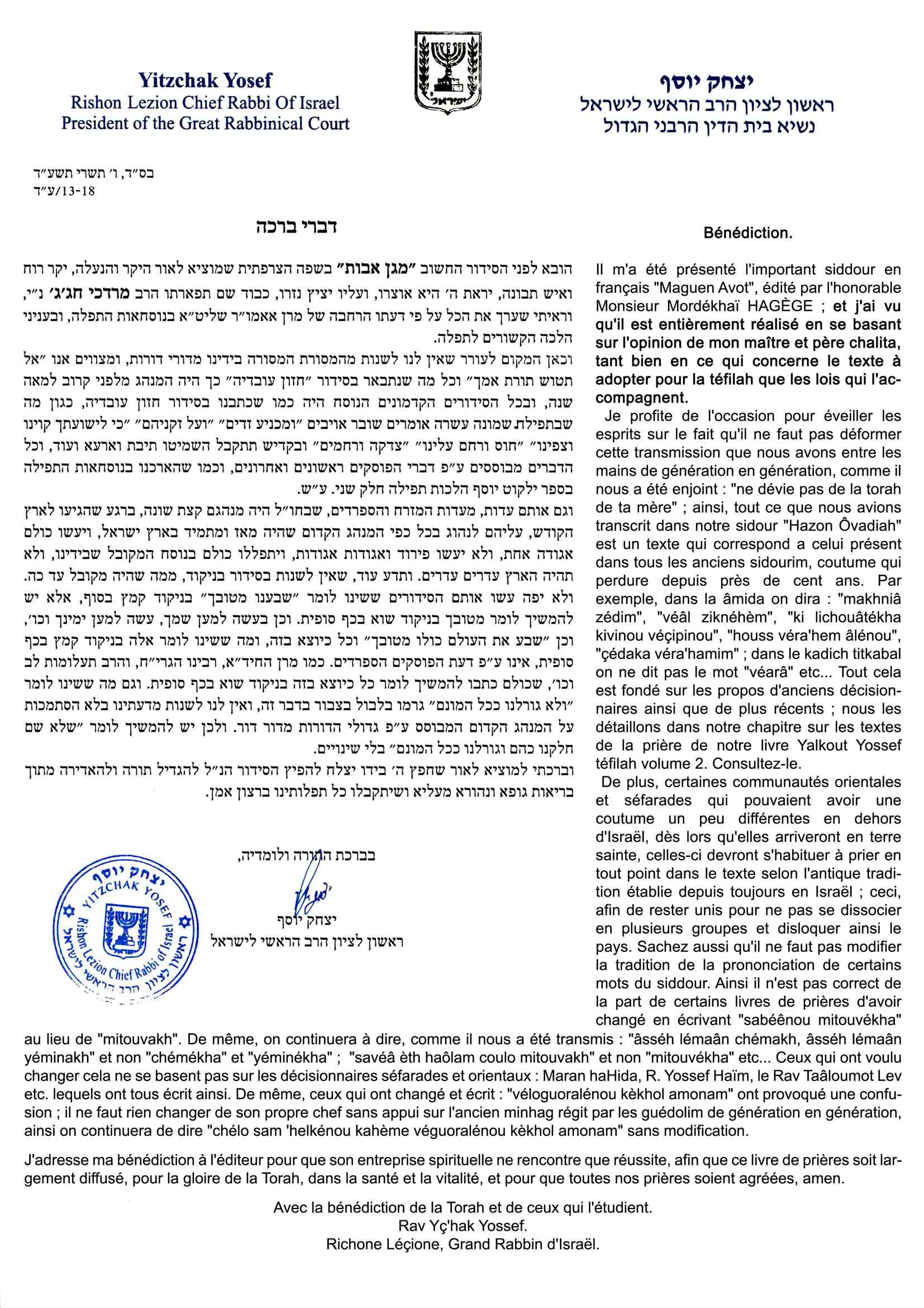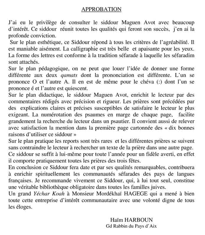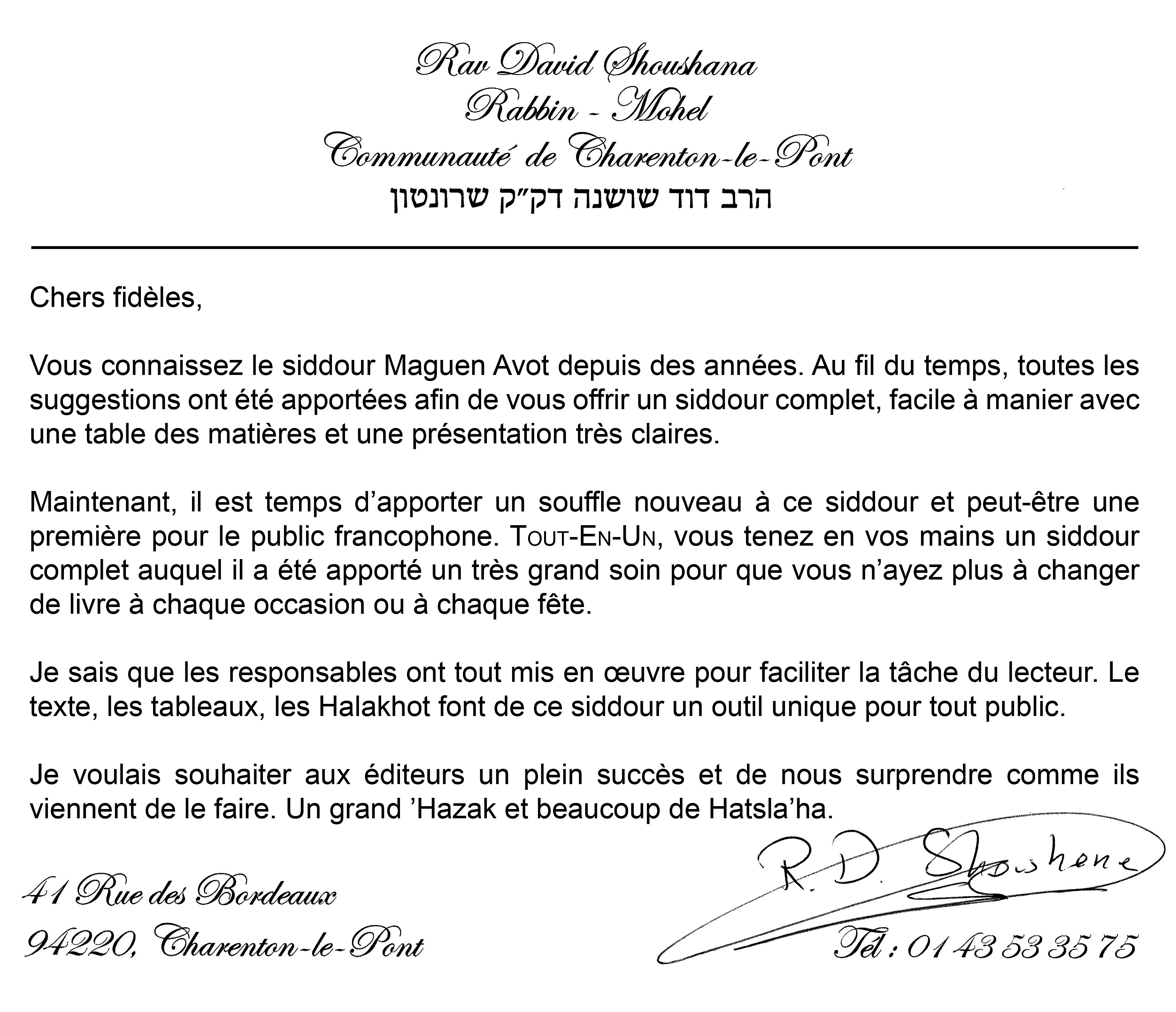 Approbation du Rav David SHOUSHANA chalita Grand Rabbin de Charenton |