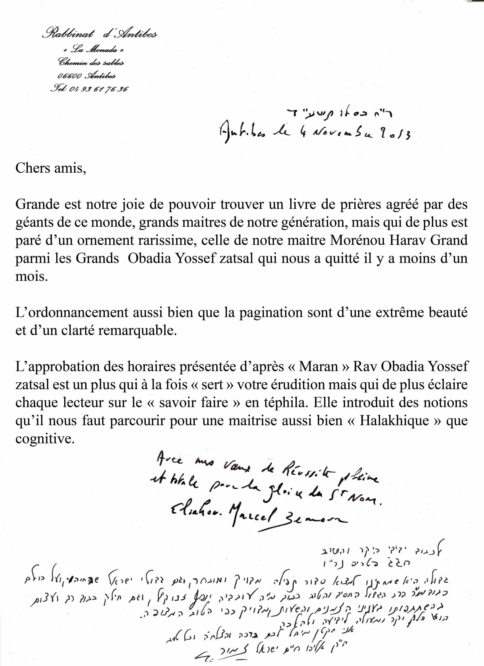 Approbation du Rav Eliyahou ZEMOUR chalita Grand Rabbin et Président du Tribunal Rabbinique d'Antibes