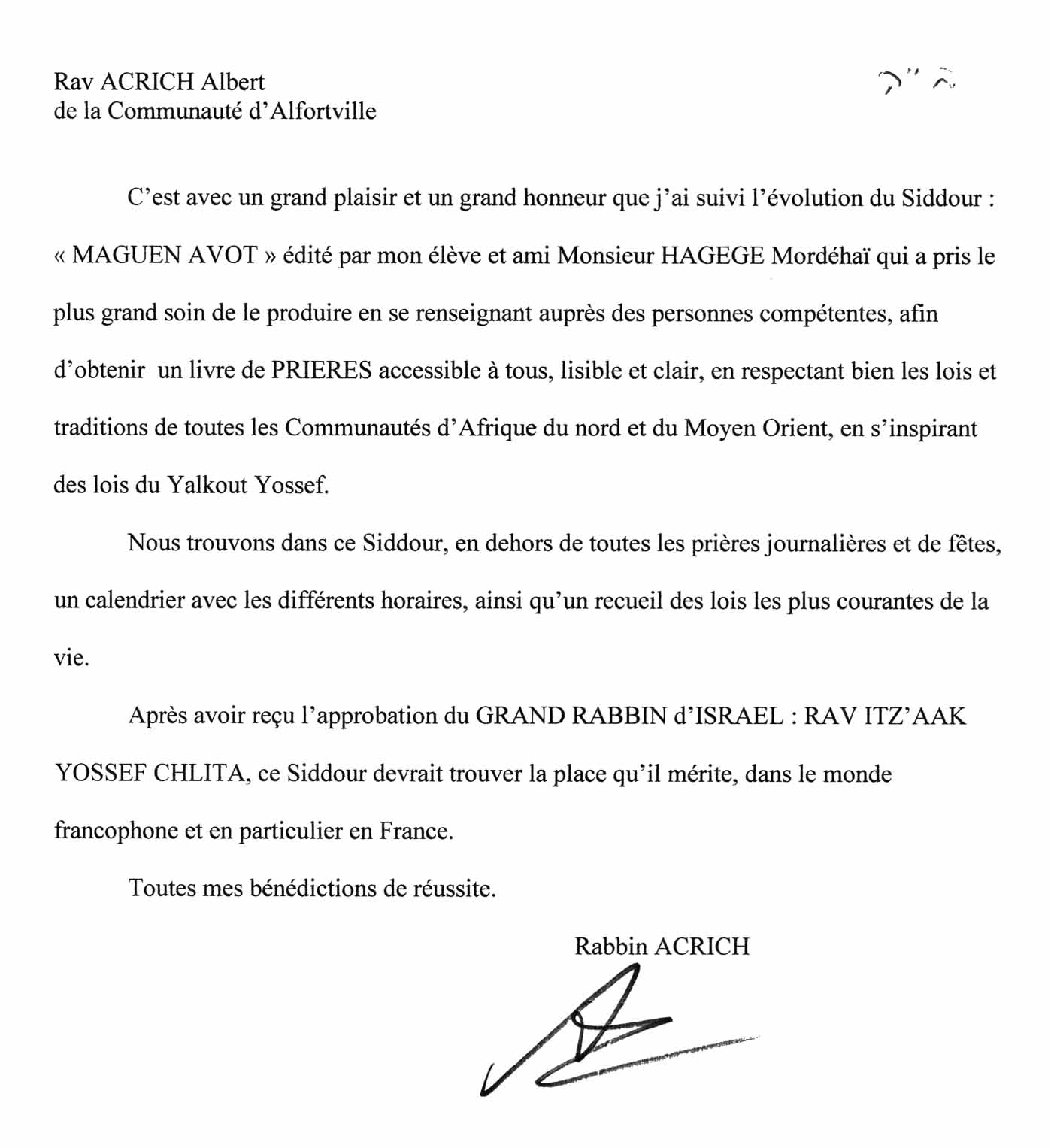 Approbation du Rav Avraham ACRICH chalita Rabbin d'Alfortville
