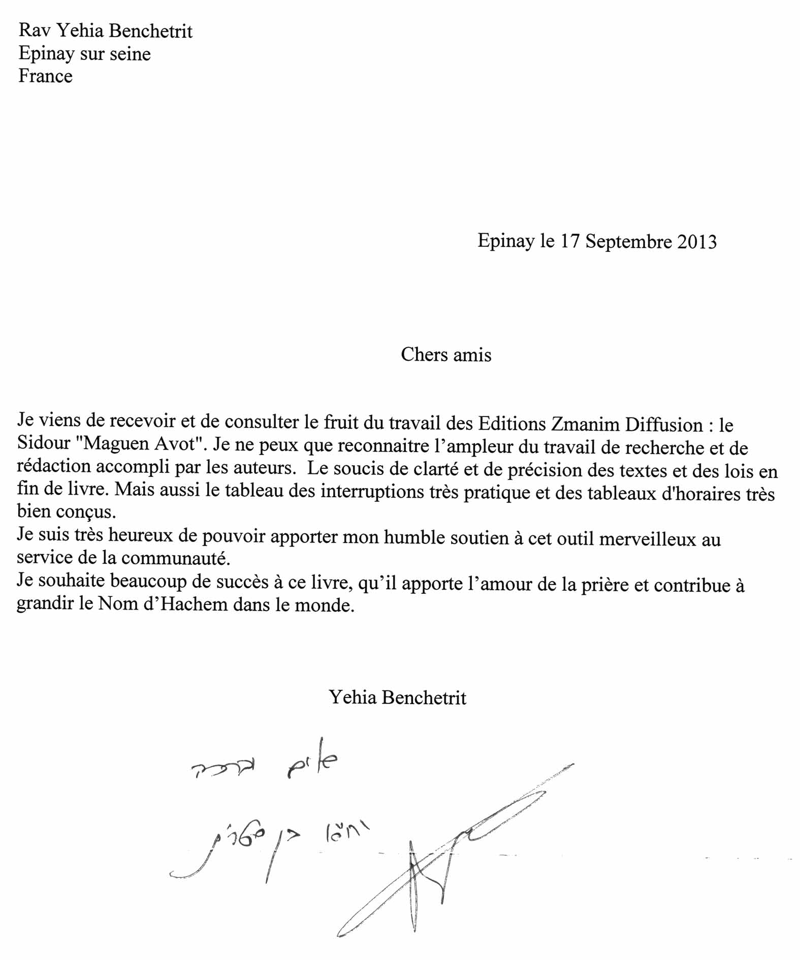 Approbation du Rav Yehia BENCHETRIT chalita Conférencier |