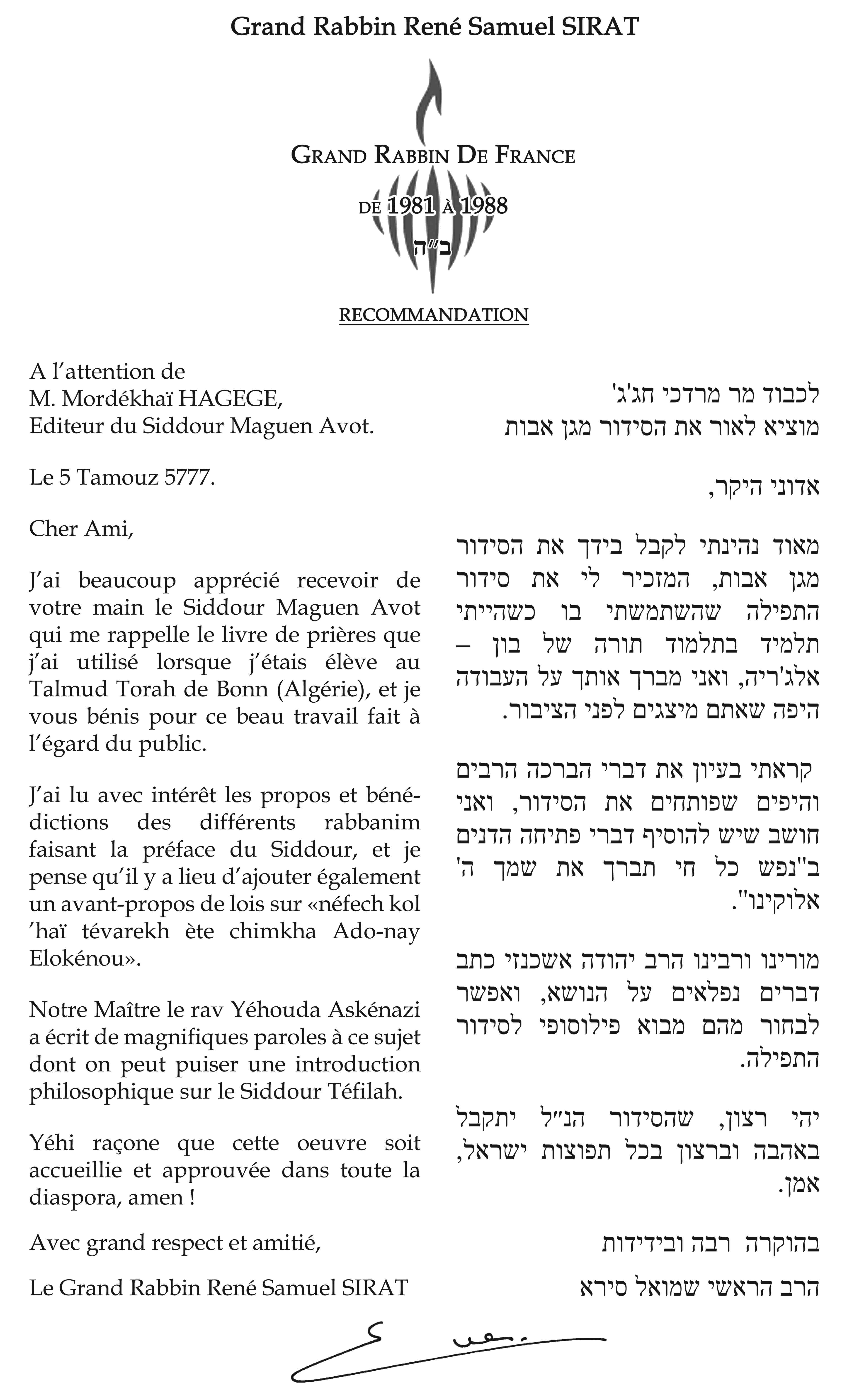 Approbation du Grand Rabbin de France René-Samuel SIRAT zatsal |